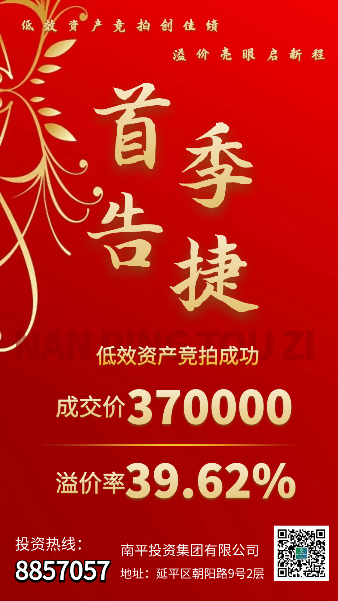3月25日,投資集團(tuán)通過南平市產(chǎn)權(quán)交易有限公司公開掛網(wǎng)招租的福建省南平市蔬菜食雜公司后谷倉庫,采用網(wǎng)絡(luò)競價(jià)模式,吸引了4名投資者的激烈角逐。經(jīng)過多輪競價(jià),最終以37萬落槌,溢價(jià)率達(dá)39.62%,遠(yuǎn)超預(yù)期。 后谷倉庫的高溢價(jià)成交,不僅是資產(chǎn)盤活的一次突破,更標(biāo)志著公司市場化運(yùn)營能力邁上新臺(tái)階。此次成交充分彰顯市場對(duì)公司優(yōu)質(zhì)資產(chǎn)的認(rèn)可,不僅直接拉動(dòng)公司資產(chǎn)收益增長,更展現(xiàn)了資產(chǎn)運(yùn)營團(tuán)隊(duì)的專業(yè)能力。 下一步,公司計(jì)劃將更多低效資產(chǎn)進(jìn)行整合升級(jí),通過定制化招商與多元化合作模式,推動(dòng)資產(chǎn)增值與運(yùn)營效率雙提升,為全年業(yè)績目標(biāo)達(dá)成提供堅(jiān)實(shí)保障。公司將以“拼”的干勁、“搶”的姿態(tài)、“實(shí)”的作風(fēng),奮力書寫高質(zhì)量發(fā)展新篇章!