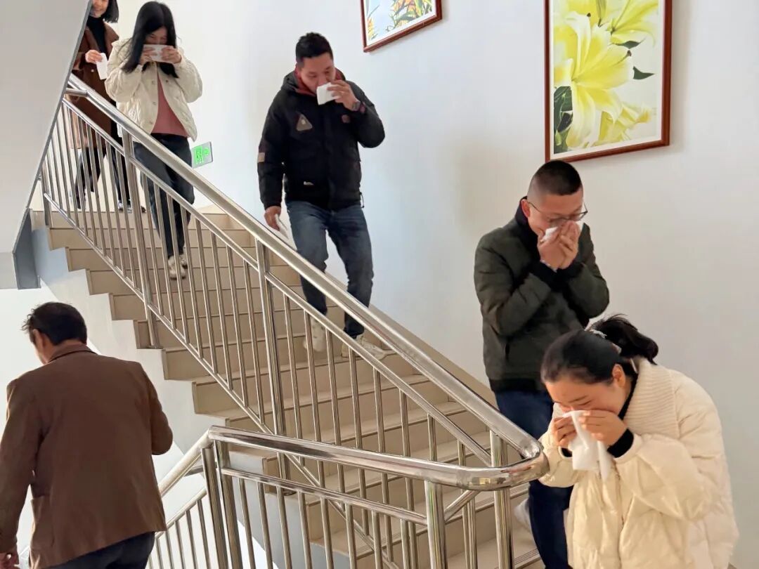 理論授課結(jié)束后,一場(chǎng)無預(yù)告的實(shí)戰(zhàn)演練隨即拉開帷幕。隨著尖銳的警報(bào)聲突然響起,演練正式啟動(dòng)。集團(tuán)副總經(jīng)理黃曉斌擔(dān)任此次演練的總指揮,迅速統(tǒng)籌協(xié)調(diào)各項(xiàng)工作。在疏散引導(dǎo)員的有序指揮下,全體員工保持冷靜,用濕毛巾或衣物掩住口鼻,采取彎腰低姿的正確姿勢(shì),沿著預(yù)定疏散路線快速、有序地向室外安全區(qū)域撤離。整個(gè)疏散過程緊張而有序,最終僅用 3 分鐘便完成了全員安全撤離,充分檢驗(yàn)了集團(tuán)應(yīng)急疏散預(yù)案的科學(xué)性與可操作性,也展現(xiàn)了員工們良好的應(yīng)急反應(yīng)能力與協(xié)作精神。