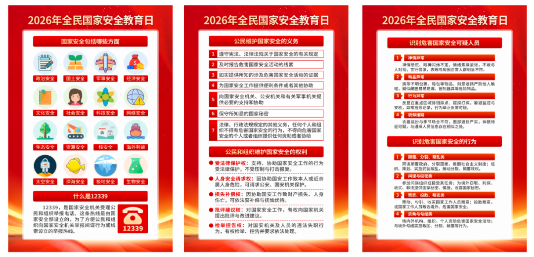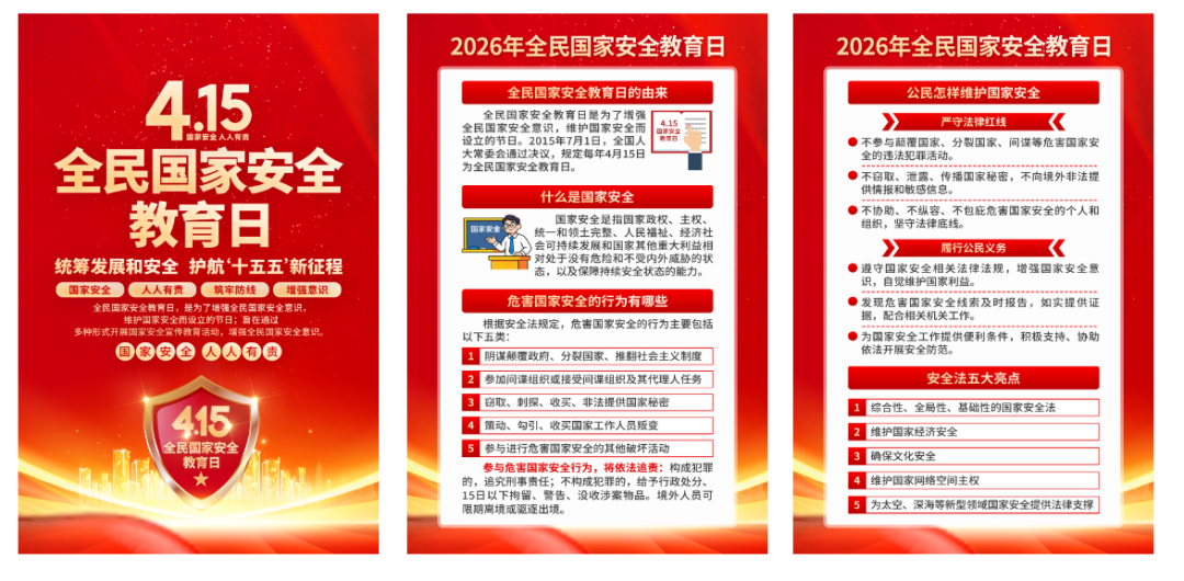 2015年7月1日,第十二屆全國(guó)人民代表大會(huì)常務(wù)委員會(huì)第十五次會(huì)議通過《中華人民共和國(guó)國(guó)家安全法》,該法自公布之日起施行。其中第十四條規(guī)定,每年4月15日為全民國(guó)家安全教育日。 2026年是國(guó)家安全法頒布施行11周年,4月15日將迎來第十一個(gè)國(guó)家安全教育日,主題是“統(tǒng)籌發(fā)展和安全,護(hù)航‘十五五’新征程”。旨在深入貫徹落實(shí)總體國(guó)家安全觀,進(jìn)一步增強(qiáng)全民國(guó)家安全意識(shí),推動(dòng)國(guó)家安全事業(yè)不斷向前發(fā)展。下面我們一起學(xué)習(xí)相關(guān)知識(shí)吧! 什么是國(guó)家安全? 2015年7月1日施行的《中華人民共和國(guó)國(guó)家安全法》明確指出:國(guó)家安全是指國(guó)家政權(quán)、主權(quán)、統(tǒng)一和領(lǐng)土完整、人民福祉、經(jīng)濟(jì)社會(huì)可持續(xù)發(fā)展和國(guó)家其他重大利益相對(duì)處于沒有危險(xiǎn)和不受內(nèi)外威脅的狀態(tài),以及保障持續(xù)安全狀態(tài)的能力。